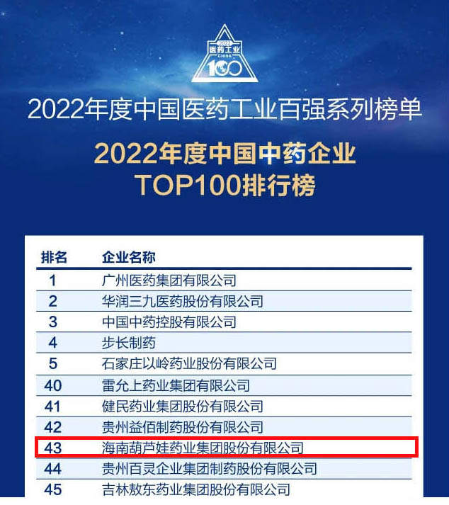 会议期间,一年一度的中国医药工业百强系列榜单隆重揭晓,菠菜导航药业集团凭借领先的研发优势和扎实的生产实力以及稳健的市场推广能力,连续第四年成功入选“2022年度中国中药企业TOP100排行榜” ,排名稳步上升至第43位。